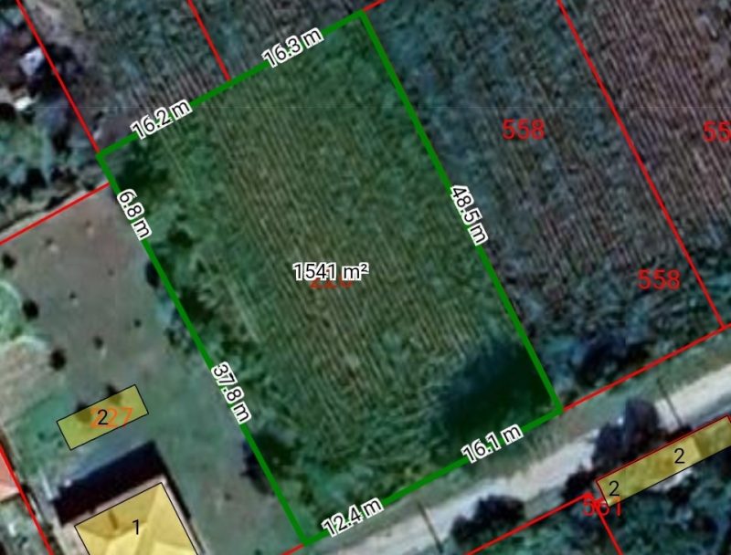 Zum Verkauf steht ein reguliertes Grundstück von 1540 Quadratmetern mit Blick auf eine Asphaltstraße. Das Gelände ist eben, Strom- und Wasseranschluss befinden sich an der Grundstücksgrenze und können problemlos angeschlossen werden. Vorgesehen für den Bau eines Hauses mit einer maximalen Höhe von 10 Metern.