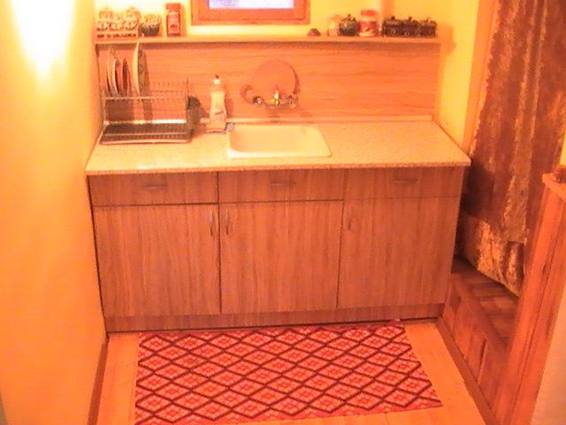 - Erster Stock: Küche und Wohnzimmer, Waschküche, Bad.