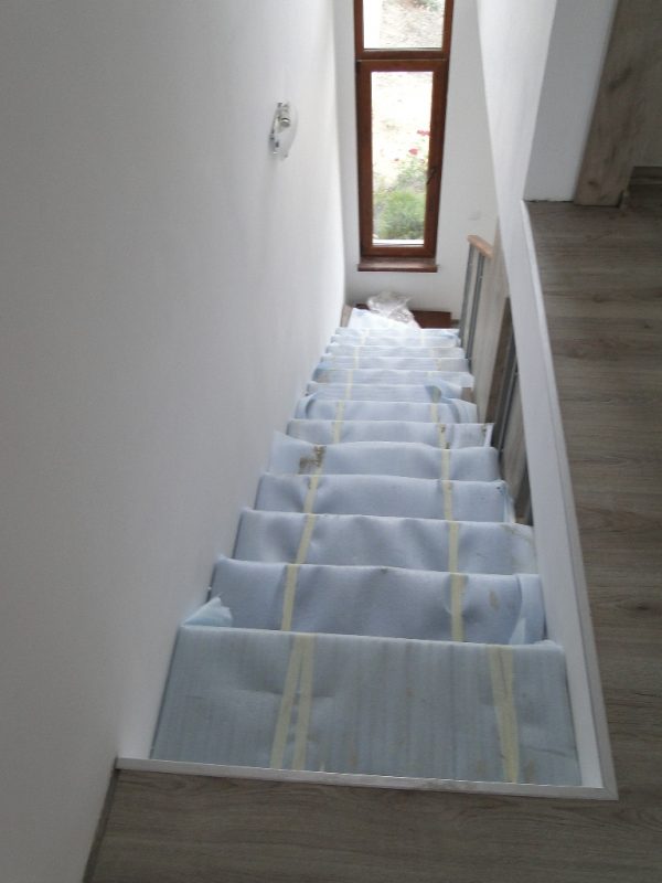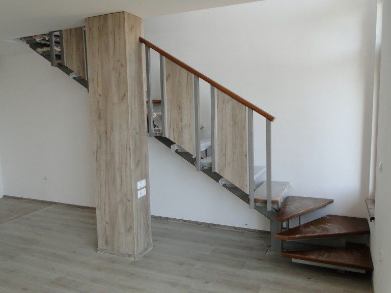 - Erster Stock: Flur, Küche und Wohnzimmer, Bad, Treppe in den zweiten Stock.