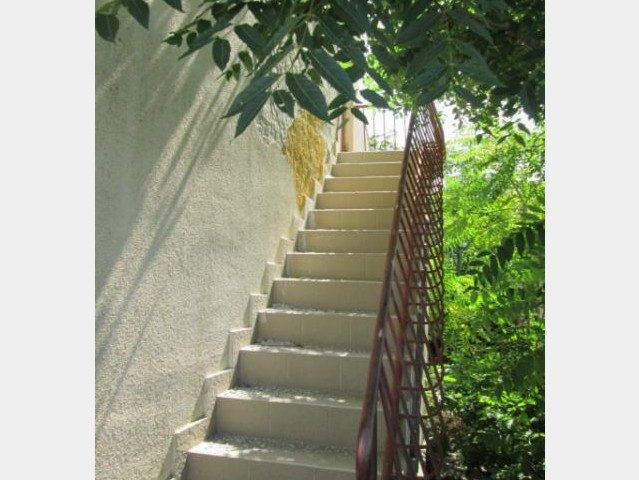 - Erdgeschoss: Küche und Wohnzimmer, Schlafzimmer, Bad, Außentreppe in den zweiten Stock.