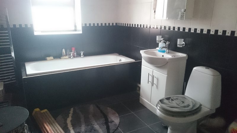 Zweiter Stock: 2 Schlafzimmer, ein großes Bad mit Badewanne und Dusche, Flur und Balkon.