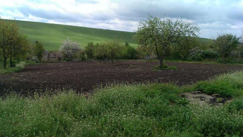 Die Größe des Gartens ist 2700 qm und es ist ein altes Bauernhaus und ein Brunnen.