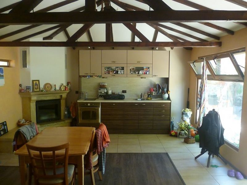 Haus 1 - / 40 qm. / Wärme- und Hydroisolation, PVC. Panoramafenster. Es besteht aus einem Zimmer mit einer Küchenzeile, Kamin, hohe Holzdecke, Laminat und Terrakotta, neue Küchenmöbel.