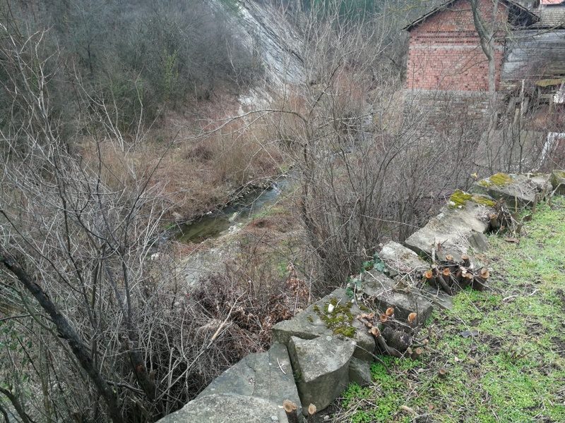 Die Größe des Gartens beträgt 420 qm. mit ein paar Obstbäumen. Das Haus grenzt an einen Fluss.