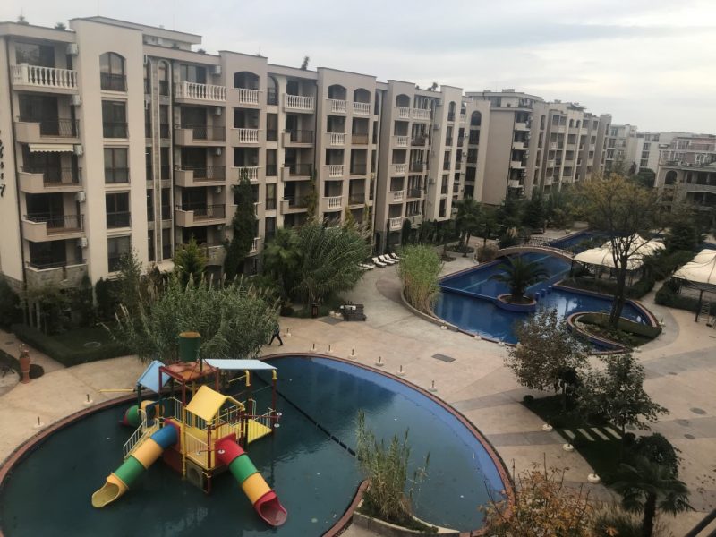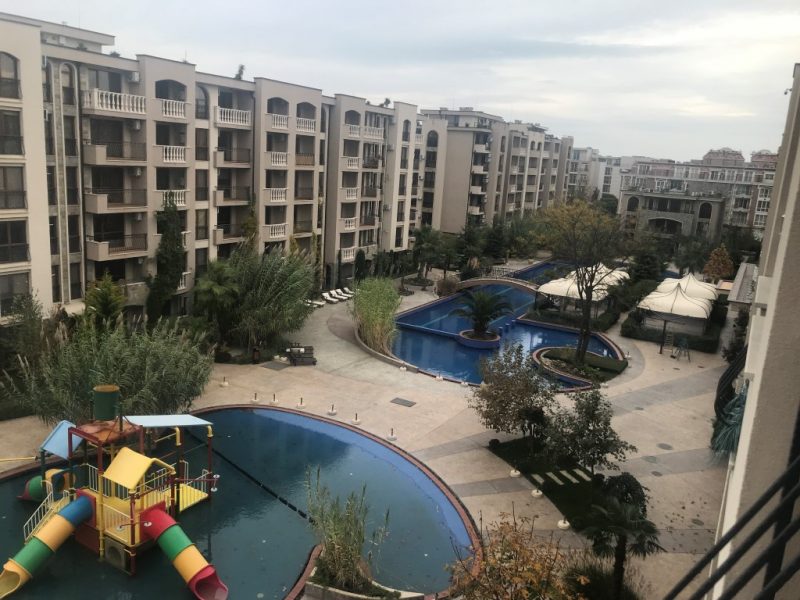 - Blick auf den Pool und das interne Territorium des Komplexes.