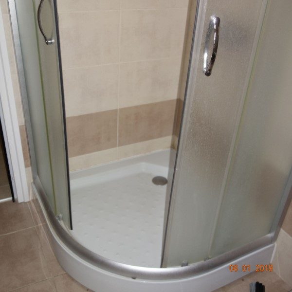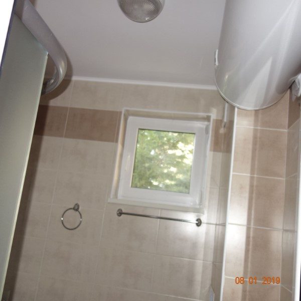 Der Preis beinhaltet eine Reihe von Luxusmöbeln und Klimaanlage. Badezimmer mit Duschkabine und Sanitär. Das Badezimmer hat ein kleines Fenster.