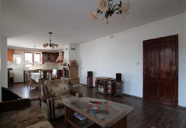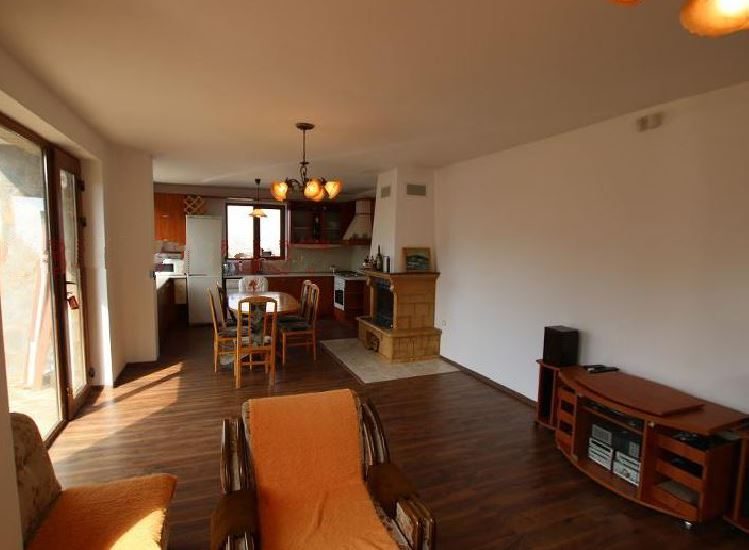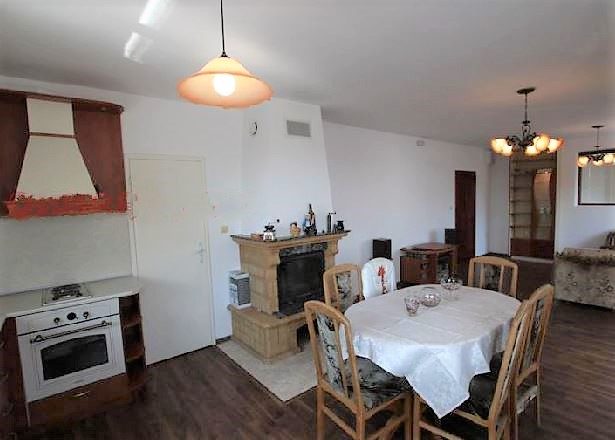 - Großes Wohnzimmer Esszimmer Küche 42 qm mit französischem Kamin, der das ganze Haus mit Ärmeln, einschließlich der Badezimmer, heizt (der Ventilator ist unter dem Dach eingebaut) Vom offiziellen Marmodom bestellt.