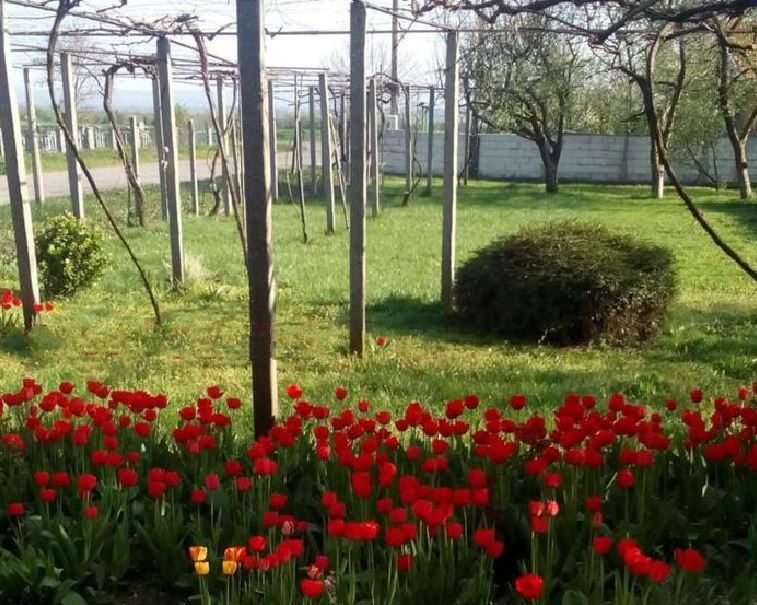 Der Garten ist ca. 800 qm groß. ist unterteilt in 2-grasige Fläche und einen bebauten Teil.