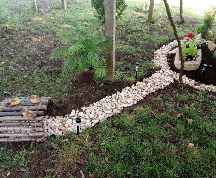 - Es gibt Obstbäume, große Gitter, Blumenbeete, Felsen und dekorative Sträucher.