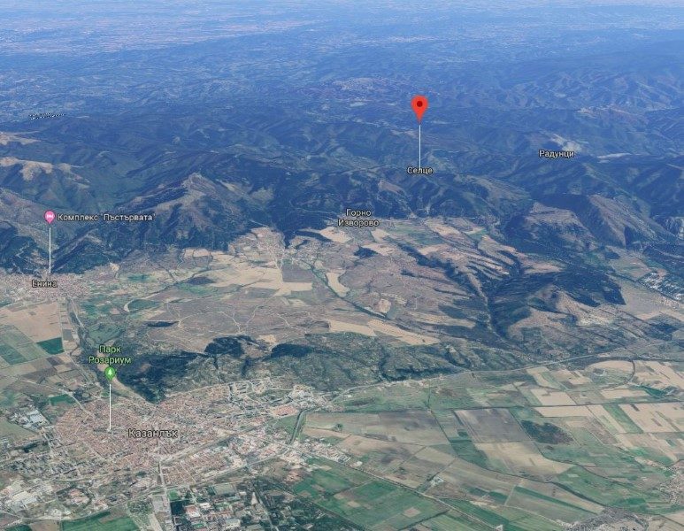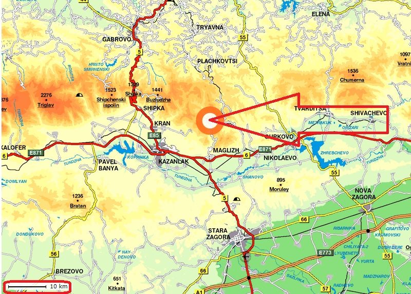 Es liegt 37 km von Stara Zagora und 17 km landeinwärts auf dem Balkan entfernt.