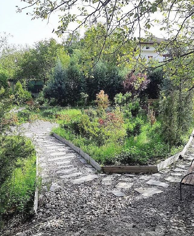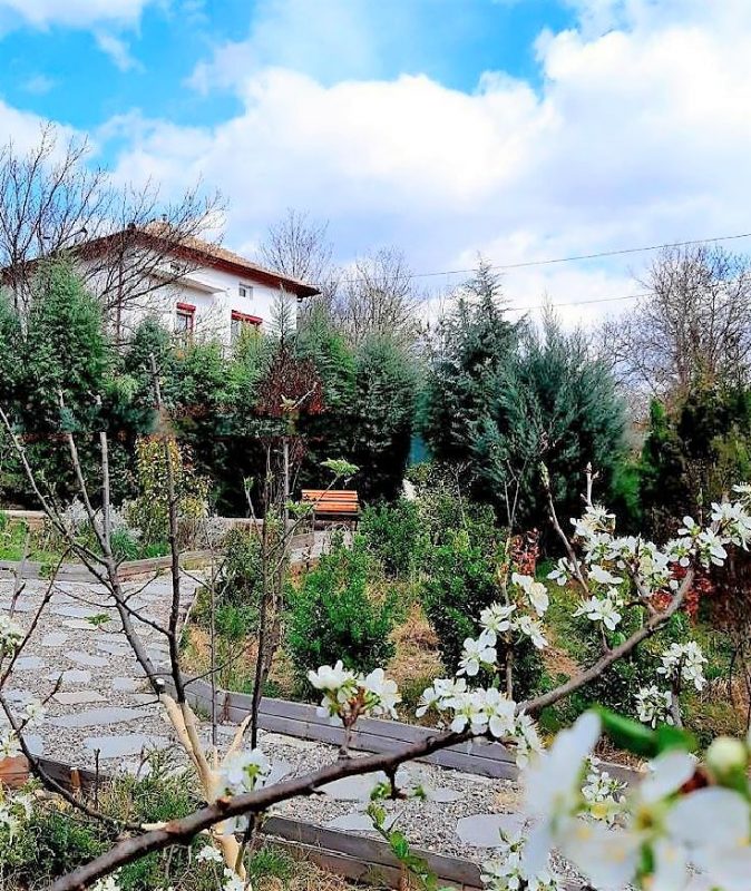 Immergrüne Zierpflanzen und verschiedene Fruchtsetzlinge werden gepflanzt, es gibt ein Bewässerungssystem. Es gibt große Walnussbäume am Rand des Grundstücks.