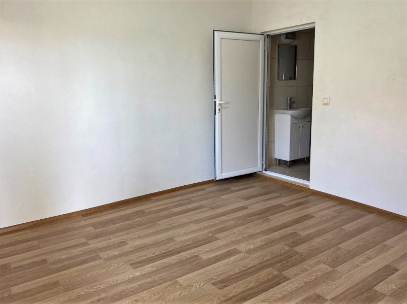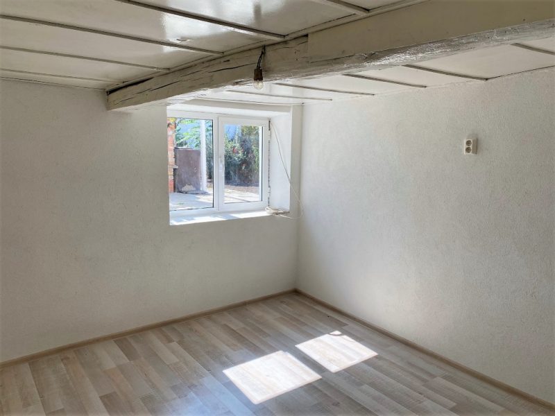 Erster Stock: Eingangshalle und zwei Zimmer, von denen eines ein Schlafzimmer mit Bad ist, das andere Wohnzimmer mit Küchenzeile.