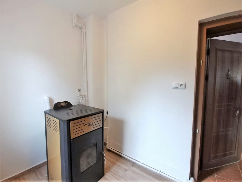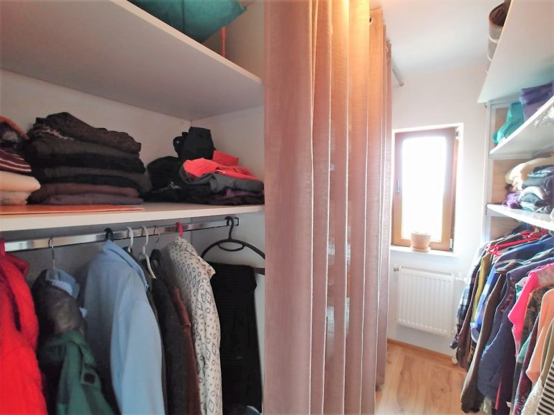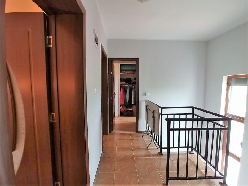 Der zweite Stock besteht aus: zwei Schlafzimmern, von denen eines einen kleinen Balkon, ein Badezimmer mit Badewanne, einen Abstellraum, ein Ankleidezimmer und eine große Terrasse hat. Das Haus wird durch einen Kamin beheizt.
