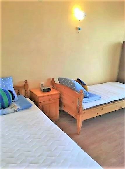 Der Garten ist geräumig, hat einen Sandkasten, Rutsche und Schaukeln für kleine Kinder.