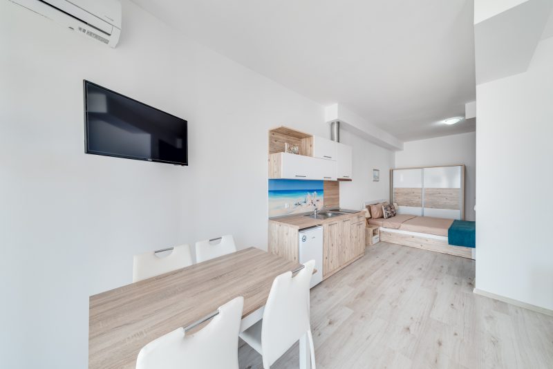 Ap 37: Stilvolles Studio-Apartment im 1. Stock, 54,71 qm Wohnfläche, geschlossene Terrasse, Kellergeschoss. Sehr lebendige Lage, nur wenige Meter vom Strand, der Bar, den Restaurants und der Balchik-Promenade entfernt.
