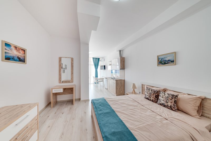 Schlafzimmer: Apartments, Möbliert Wohnfläche: 54.71 qm Schlafzimmer: Studio; Fußboden: 1/1; Aufzug: Nein Gebiet: Stadt Balchik, 1 min zum Strand |