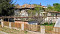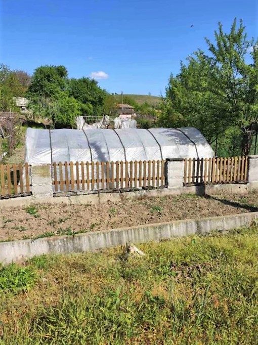 Der Garten ist geadelt, Obstbäume, Weinreben, es gibt ein Gewächshaus. Es grenzt an eine asphaltierte Straße.