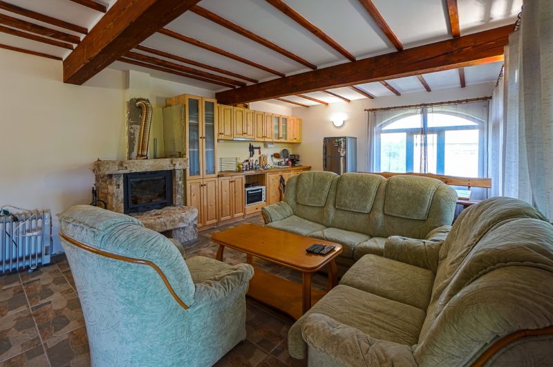 Im Wohnzimmer befindet sich ein Kamin, der im Winter viel Gemütlichkeit schafft. Die Küche ist aus Massivholz mit Eichenplatte, sehr komfortabel und mit viel Stauraum dank der vielen Schränke,