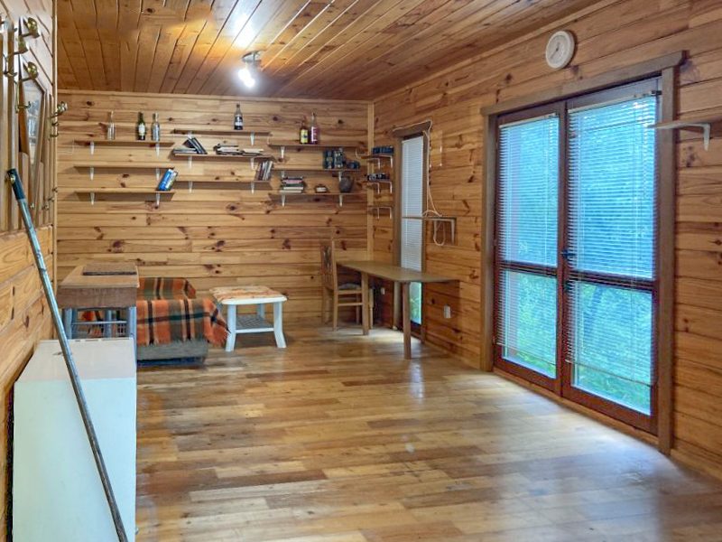 Haus 2 ist aus Holz, made in Germany. 50 Quadratmeter. Es besteht aus einem Wohnzimmer, einer Küche, einem Schlafzimmer, einem Badezimmer mit Toilette.