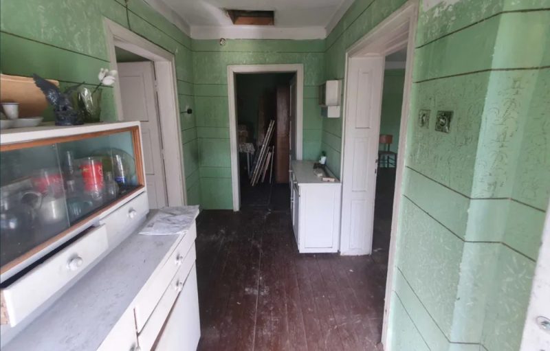 Das Erdgeschoss besteht aus 3 Zimmern - einem Wohnzimmer mit Kochnische, einem separaten Zimmer und einem kleinen Schrank (gut geeignet, um ein Badezimmer zu werden).