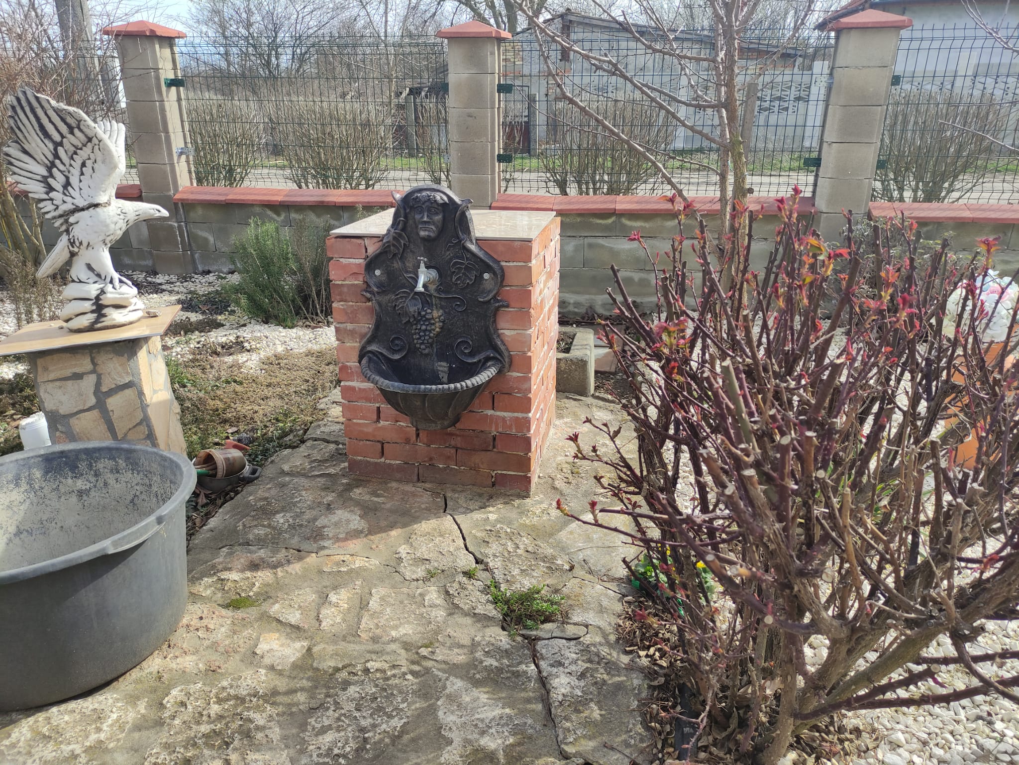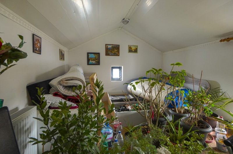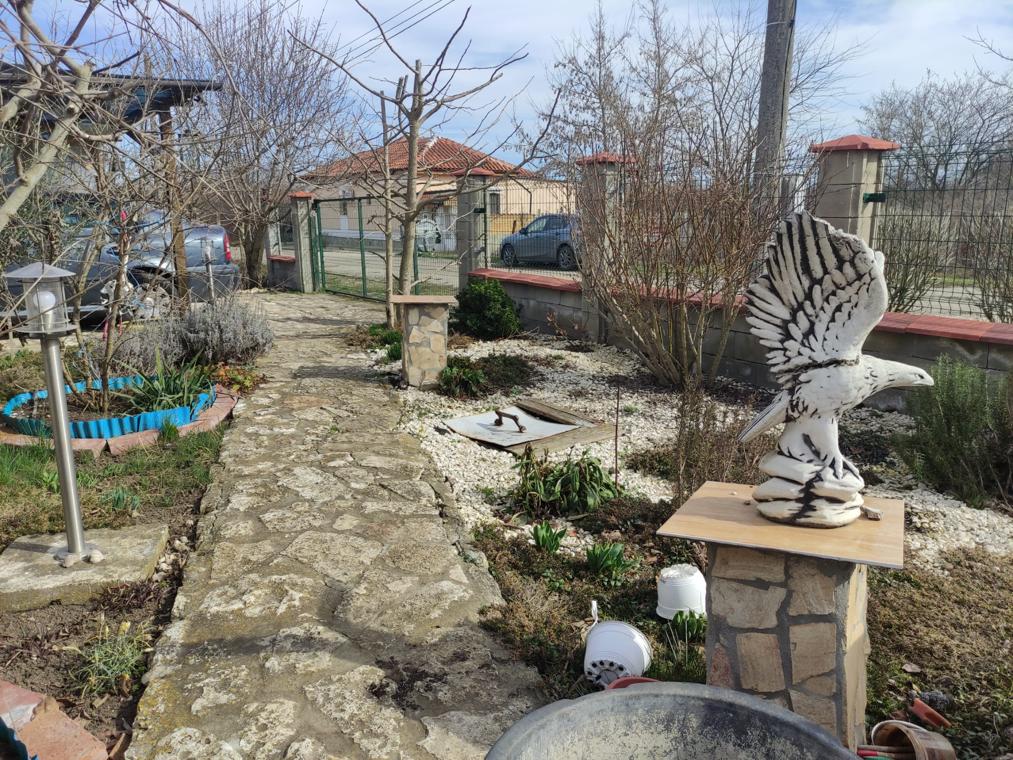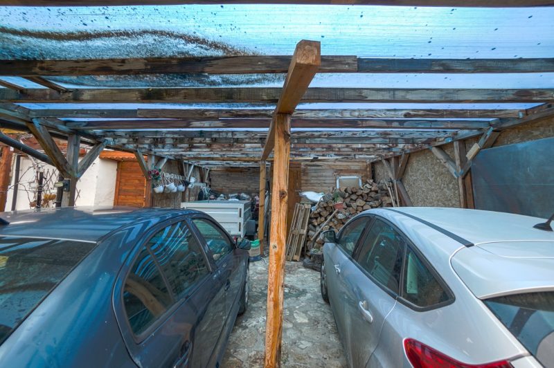 Im Garten gibt es einen Autostellplatz für 4 Fahrzeuge und einen Holzschuppen. Die Zufahrt erfolgt über eine asphaltierte Straße.