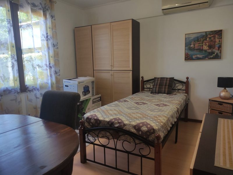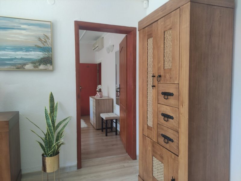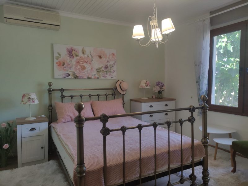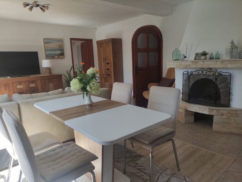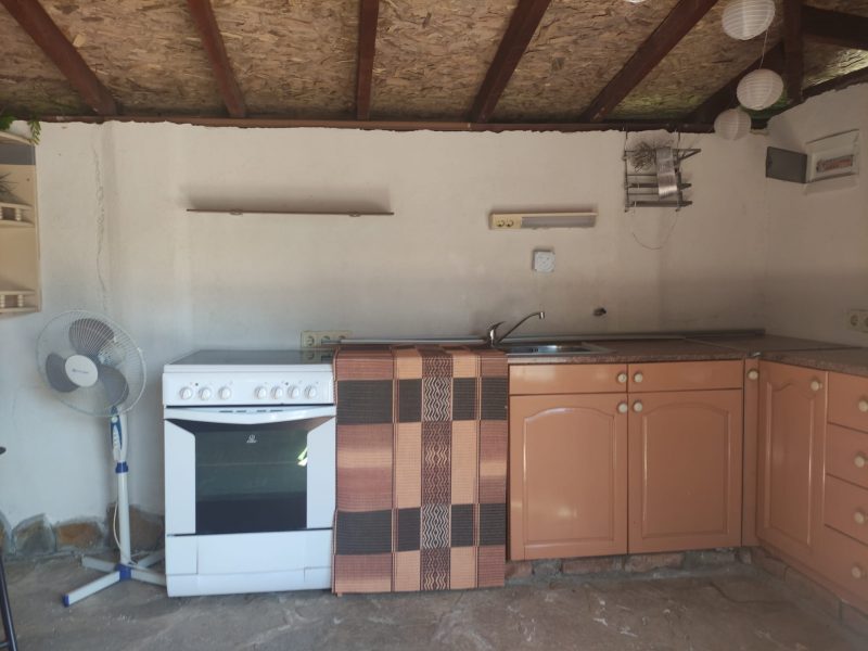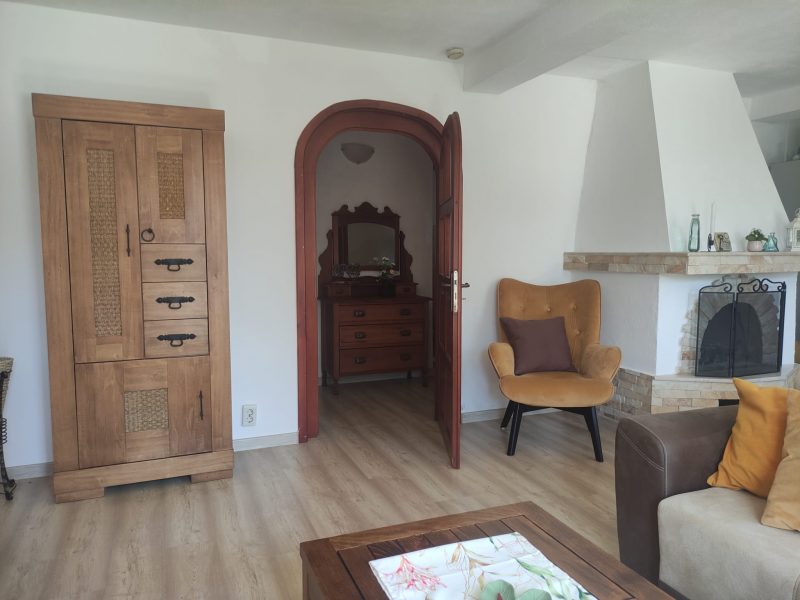 Der offene Wohnbereich vereint Küche und Wohnzimmer und ist mit einer vor einem Jahr neu eingebauten Küche ausgestattet. Ein massiver Steinkamin sorgt für eine gemütliche Atmosphäre ohne Rauch. Das Hauptschlafzimmer ist mit einem Doppelbett, einem Kleiderschrank und einer Klimaanlage ausgestattet. Ein zweites Schlafzimmer bietet Blick auf den Pool und ist ebenfalls möbliert. Ein dritter Raum wird derzeit als Abstellraum genutzt, bietet jedoch vielseitige Nutzungsmöglichkeiten. Das Badezimmer und die Toilette sind separat und liegen nebeneinander. Ein zusätzlicher Raum, ursprünglich als zweites Badezimmer vorgesehen, wird derzeit als Werkstatt genutzt, es sind jedoch alle Anschlüsse vorhanden. Ein Durchgangsraum eignet sich hervorragend als Lagerraum oder Kleiderschrank.