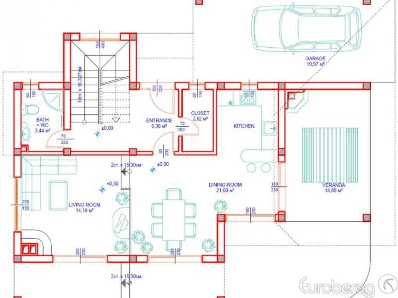 - Im Erdgeschoss befinden sich Villen: Diele, Esszimmer mit Küche, Bad, WC, Veranda.