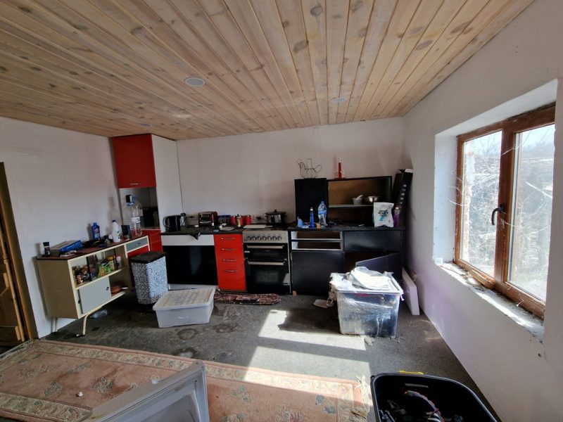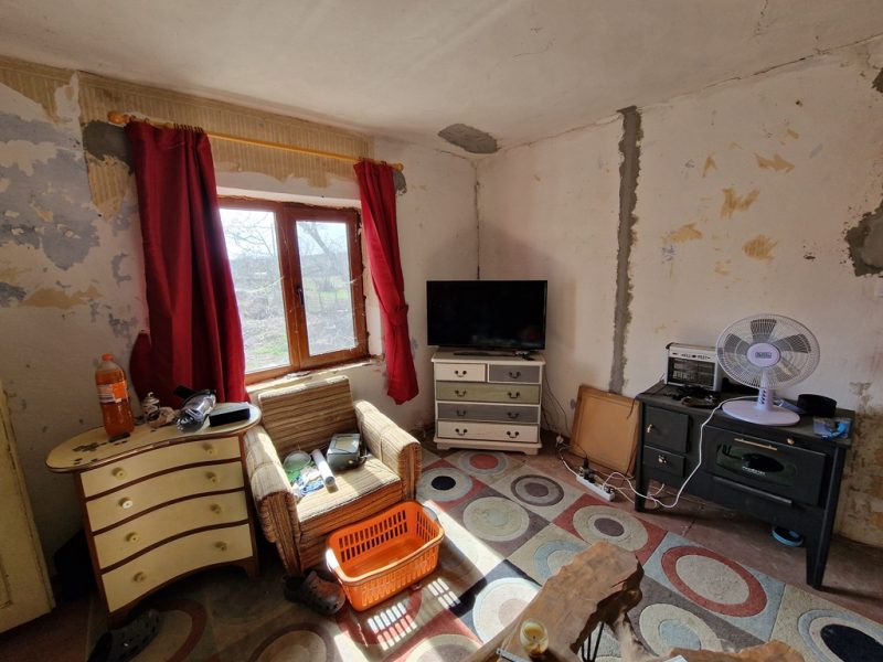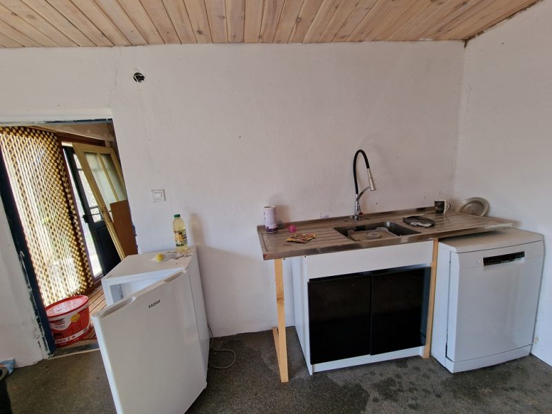 Das Haupthaus verfügt über ein neues Dach (mit Wärmedämmung, neuem Holz und Balken sowie neuen Ziegeln), ein neues Duschbad mit WC, eine neue Küche, neue Kunststofffenster und -türen, neue Sanitäranlagen, eine neue Elektrik und eine neue, große Klärgrube. Es gibt zwei Eingänge: einen mit Balkon und großen PVC-Doppeltüren mit Blick auf den Garten und einen zweiten auf der gegenüberliegenden Seite neben der großen Garage. Vom ersten Eingang aus gelangt man in eine große Diele mit drei Türen. Die erste Tür führt in den 20 m² großen Keller (der als Esszimmer oder Kneipe genutzt werden kann), die zweite in einen Raum mit Wasseranschluss und Waschmaschine (der als Waschküche oder Schlafzimmer genutzt werden kann). Die Tür gegenüber der Diele führt ins Haupthaus. Dort befinden sich die Küche, ein Flur mit einer großen PVC-Doppeltür, die zum zweiten Eingang und zum Balkon führt, ein Duschbad mit WC, ein Wohnzimmer, ein weiterer kleiner Flur und ein renoviertes und möbliertes Schlafzimmer.