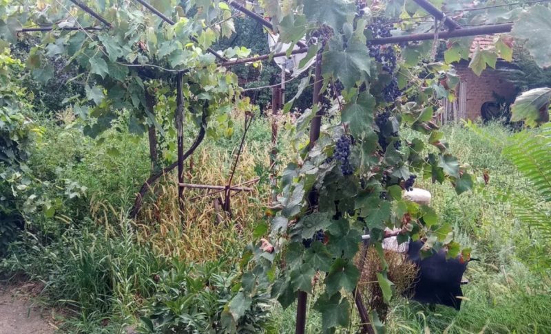 Der Garten ist mit Obstbäumen und Weinreben bepflanzt.