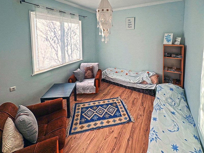 Das Haus besteht aus einem Flur, drei Schlafzimmern, einer Taverne mit Kamin und einer Küche. Es eignet sich sowohl für ganzjähriges Wohnen als auch für einen Urlaub abseits der Stadt.