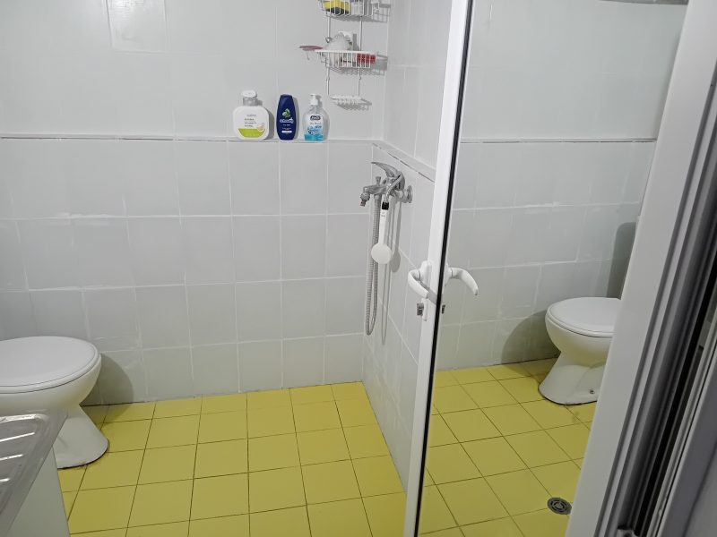 - Badezimmer mit Dusche, Waschbecken und Toilette