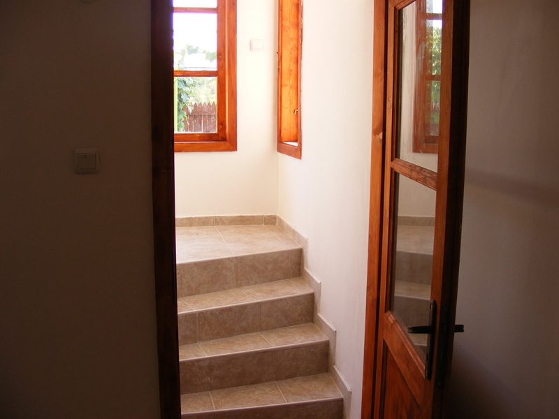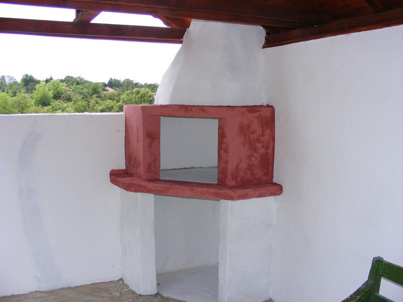 Die erste Etage verfügt über eine Sommerküche, ein Schlafzimmer mit Kamin, ein großes Wohnzimmer (Taverne), Badezimmer mit Badewanne und WC, Platz für Waschmaschine, Abstellraum, Grill und Garage. Auf der zweiten Etage Wohnraum (Küche) mit überdachter Veranda, zwei Schlafzimmer, ein Badezimmer mit Dusche Durchschnitt zweiten Kamin.