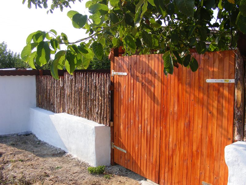 Der Hof ist mit Stein und Holz eingezäunt. Vor und um die Häuser sind 120m2 Pfad aus Stein gebaut.