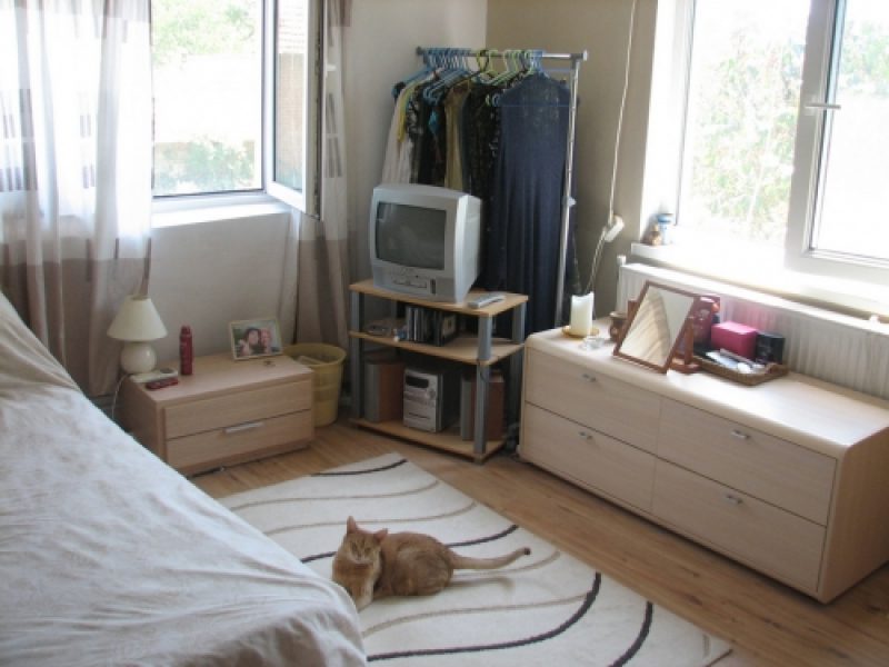 Tür zum Wohnzimmer (3.4mx 3.4m): Fliesenboden 2 Fenster (eine Öffnung) TV Antennenbuchse Wandleuchten Rückseite Holzofen und Rohre (hält Zimmer warm) Tür zum Keller / Abstellraum (4m x 3m): kleine Fensteröffnung in Flur Betonboden Steinmauern wies Gipskarton