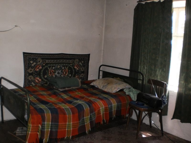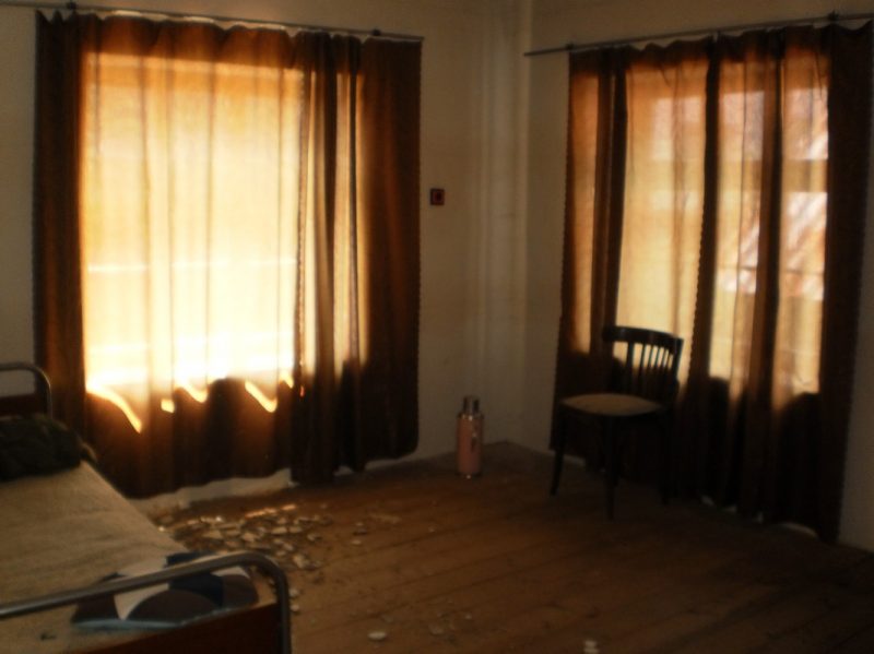 Erster Stock: Eine interne Treppe führt in dieser Etage. Der Wohnbereich ist zwischen einem Korridor und drei Räume verteilt. Die Wände sind aus Steinen, die Fußböden sind aus Holz. Die Fenster haben Holzrahmen.