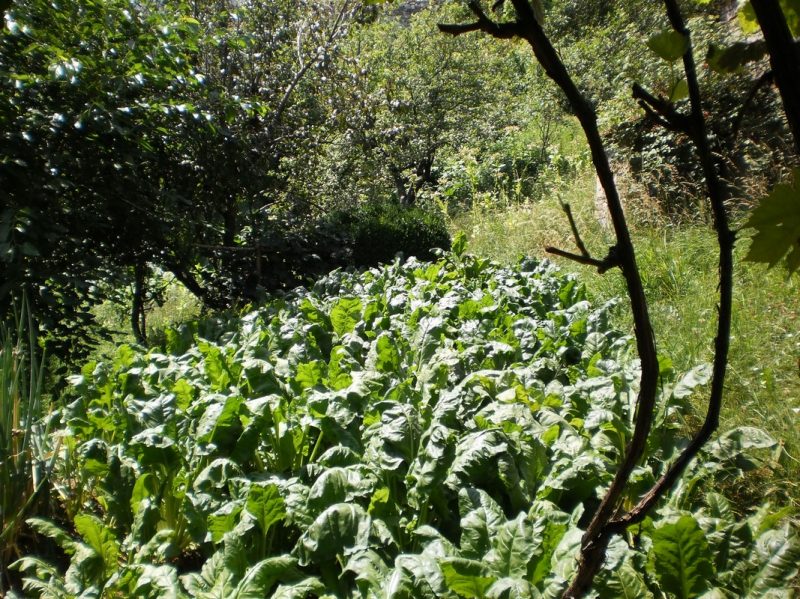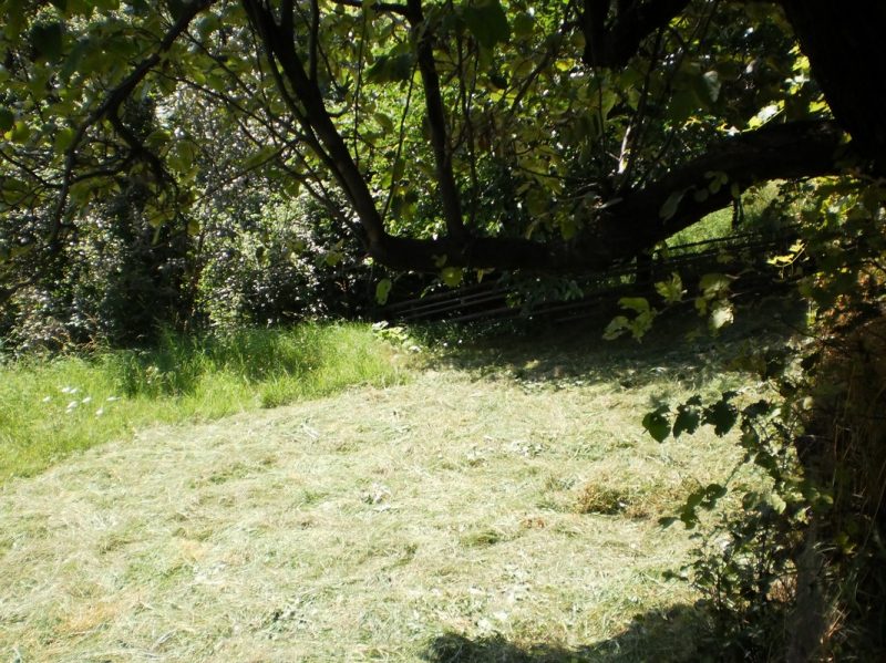 Der Garten ist mit Obstbäumen und Blumen gepflanzt.